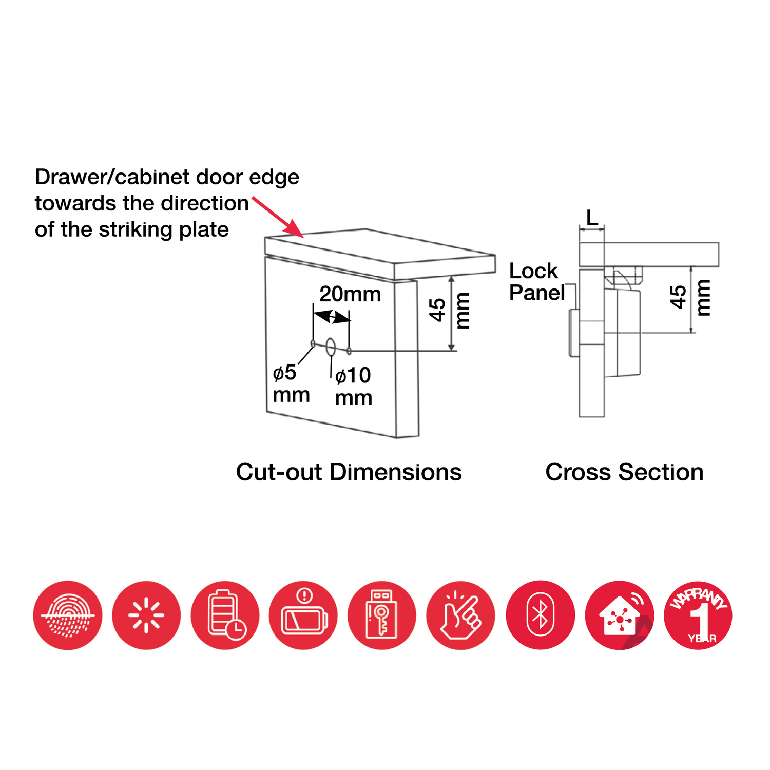 Access Modes: Capacitive Fingerprint (Up to 20 unique accesses) and E-Key