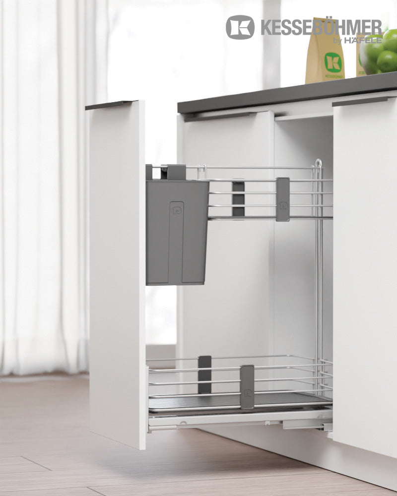Set components complete with 1 pull out frame, 1 tray, 4 lift-out plastic containers, 4 dividers, full extension with integrated soft closing mechanism and fixing material